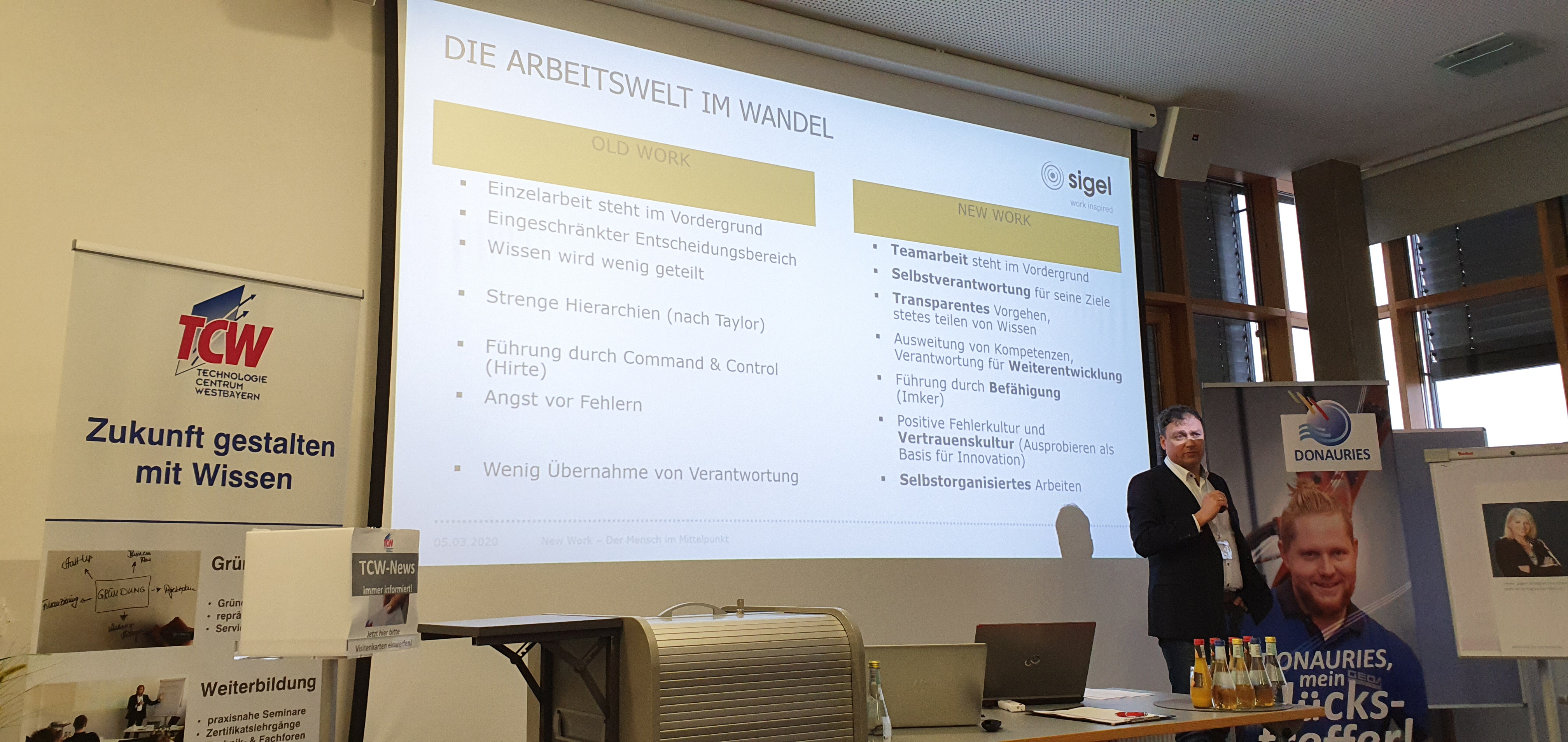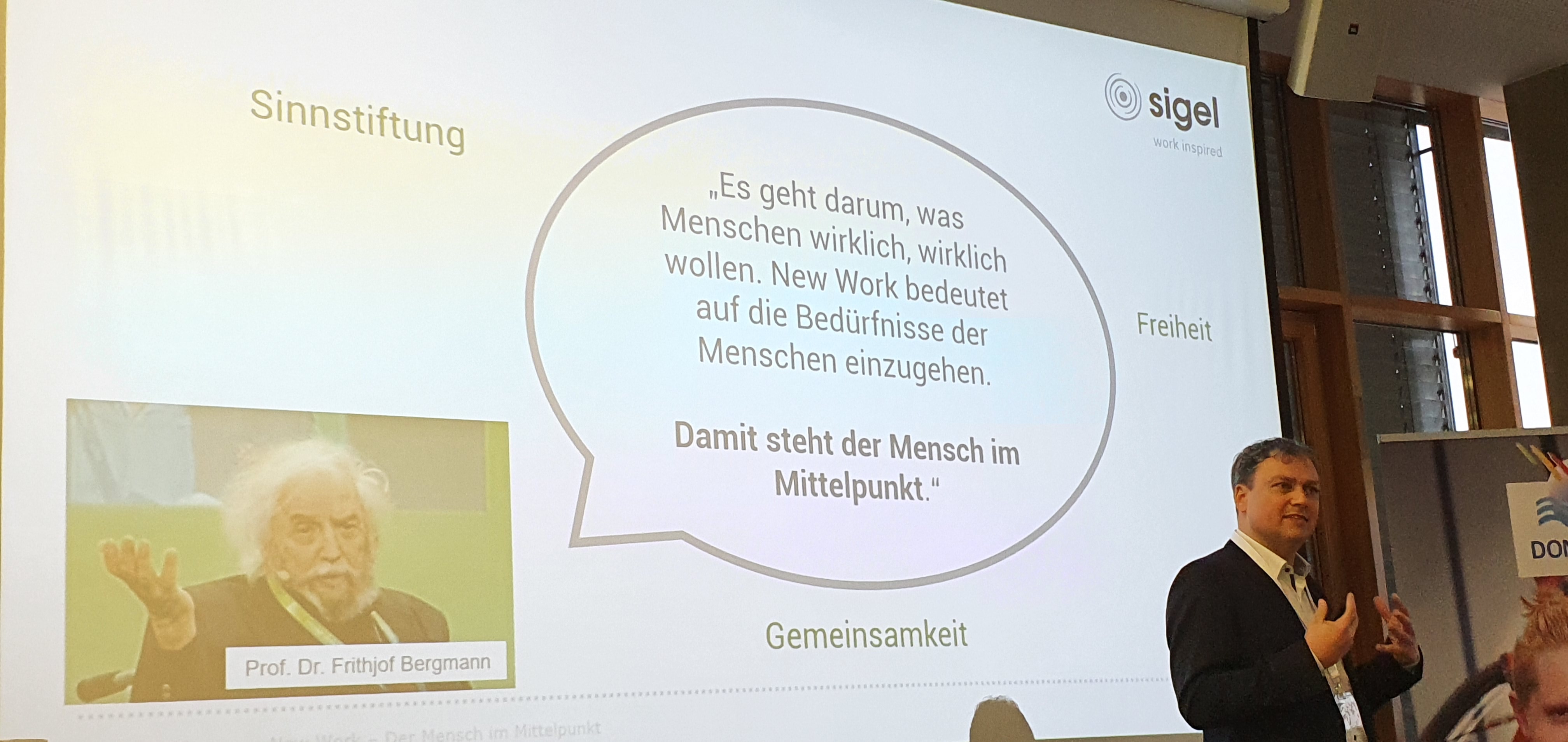 Daniel Petrasch (Prokurist, Sigel GmbH) ergänzte den Vortrag von Fr. Hansel, indem er Hr. Bergmanns „New Work“ Konzept detaillierter erklärte. Bei „New Work“ steht Teamarbeit im Vordergrund. Man hat Selbstverantwortung für seine Ziele und ein transparentes Vorgehen. Die Ausweitung von Kompetenzen wird gefördert, indem man die Möglichkeit hat, sich weiterzuentwickeln. Mitarbeiter sollten durch Befähigung und Begleitung geführt werden. Die Unternehmenskultur basiert auf Vertrauen und selbstorganisiertem Arbeiten. Hr. Petrasch präsentierte die Unternehmenskultur der Firma Sigel als das gemeinsame Fühlen, Denken und Handeln. Die im Unternehmen vermittelten Unternehmenswerte sind z.B. die Übernahme von Verantwortung, das Schaffen von Vertrauen, die Gestaltung der Zukunft und die Ausführung von Leistung.